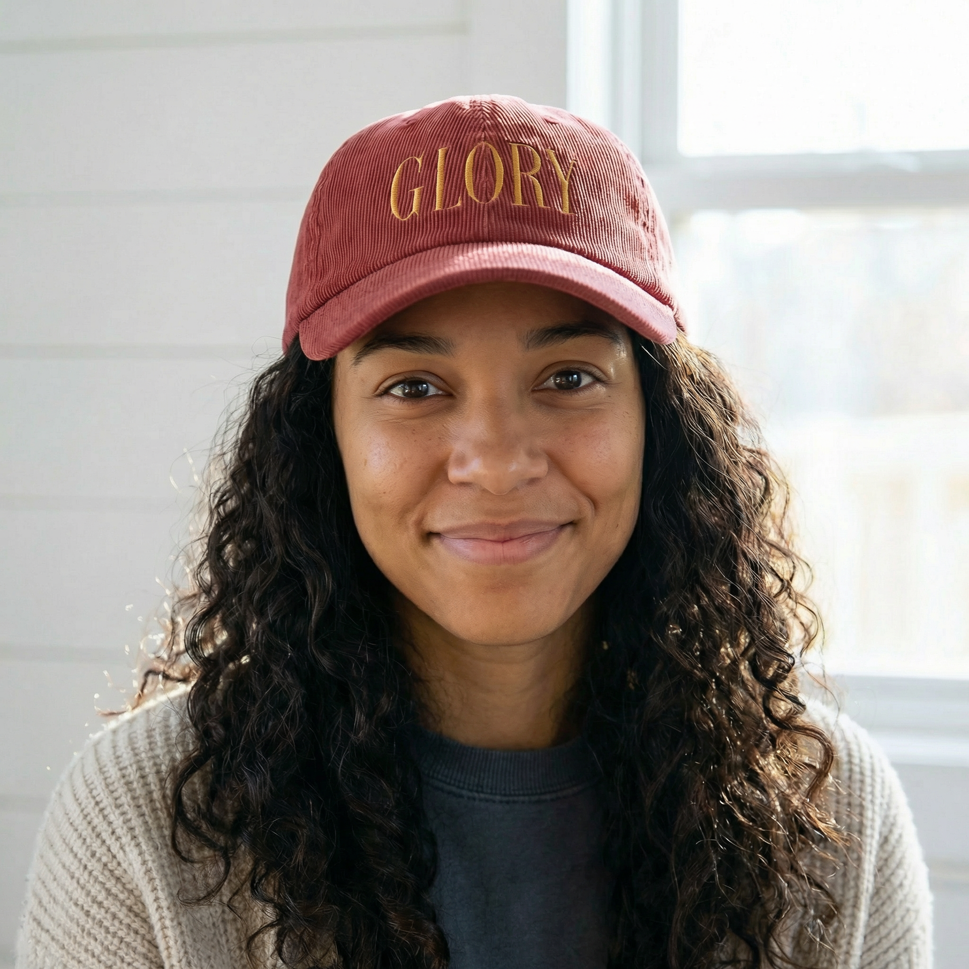 The GLORY 1 Corinthians 11 Hat in Burgundy with Old Gold embroidery is a reverent statement piece inspired by the fullness of 1 Corinthians 11:1–16.