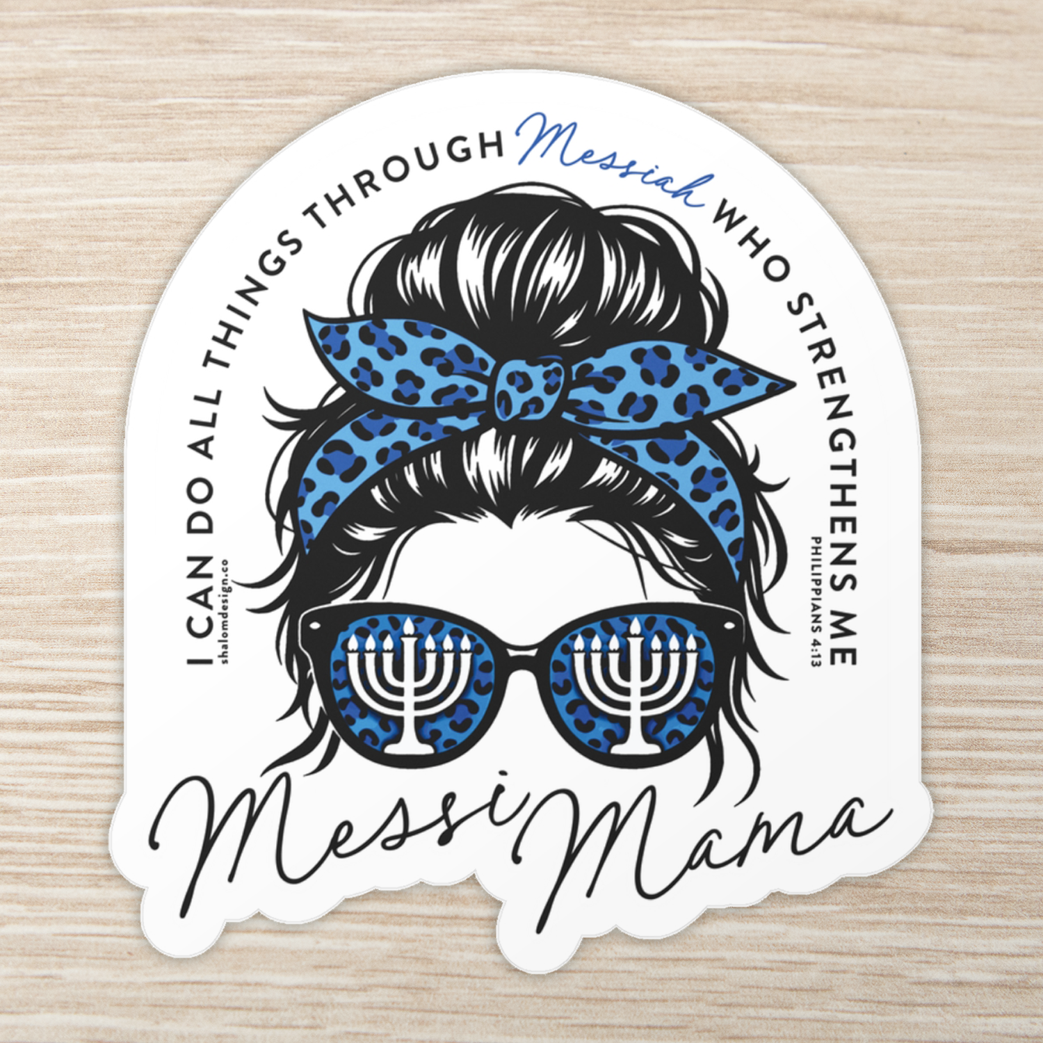 The Messi Mama Sticker is a bold, faith-filled reminder for the mama who leans on Messiah for strength every single day. Part of the Messi Mama Collection, this kiss-cut vinyl sticker features the beloved “messy bun mama” graphic with menorah sunglasses and blue leopard detail, with “Messi Mama” in script underneath.