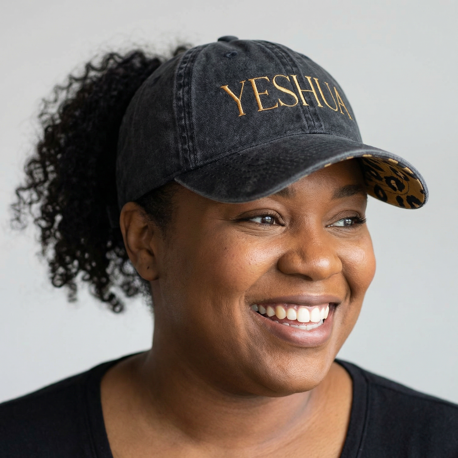 YESHUA Ponytail Hat (Black/Leopard) | Bronze Embroidery